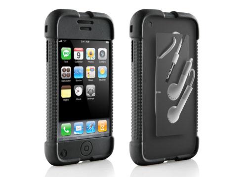 DLO Jam Jacket ($24.99) – this one looks like a simple silicone overlay, and it is, though there’s a twist around back. Instead of a belt clip, there’s a hard silicone protrusion which is used to wrap your headphone cord around, and even indentations for inserting Apple’s stock earbuds. There are a bunch of problems with this case: it doesn’t protect the screen in any way. It doesn’t have a belt clip, so if you want to use it that way, you can’t. Worse, if you want to stick the iPhone in your pocket, that’s difficult, too, because the cord winding thing sticks out. Finally, if you don’t use Apple’s stock ear buds – I don’t – then they won’t fit in the spots cut out for them on the rear protrusion, either. If it fits your needs perfectly, great. But I can’t generally recommend this one.