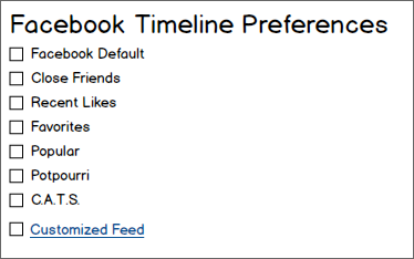 So instead of continuously reworking the magic algorithm (and upsetting the revenue generators while they’re at it), Facebook should switch strategies, and follow the same things that the audio/video industry figured out a long while ago: create some feed profile archetypes, and let the users take control.