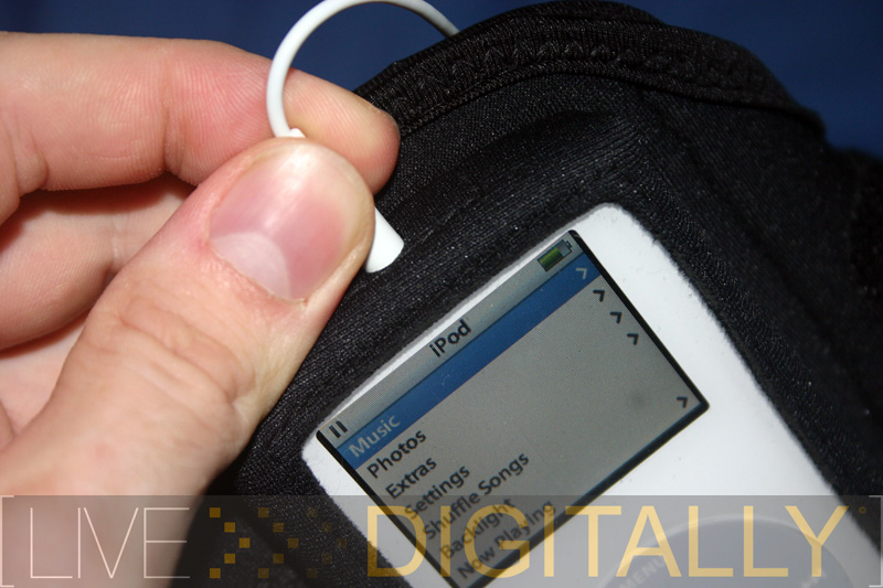 Both the top and bottom of the case contain small holes for your headphones. XtremeMac calls these holes “self-sealing,” which conjures mental pictures of a space-age fabric capable of detecting moisture and moving to prevent it from getting through. In reality, it means that these openings are made of two layers of neoprene. Each has a single hole that’s imperfectly aligned with the one next to it, meaning some fumbling can be required to push a headphone plug through the holes and into the iPod jack. If it’s difficult to push a headphone plug into the iPod, nothing short of a good splash of liquid is likely to make its way through, especially if a headphone plug is filling that hole.