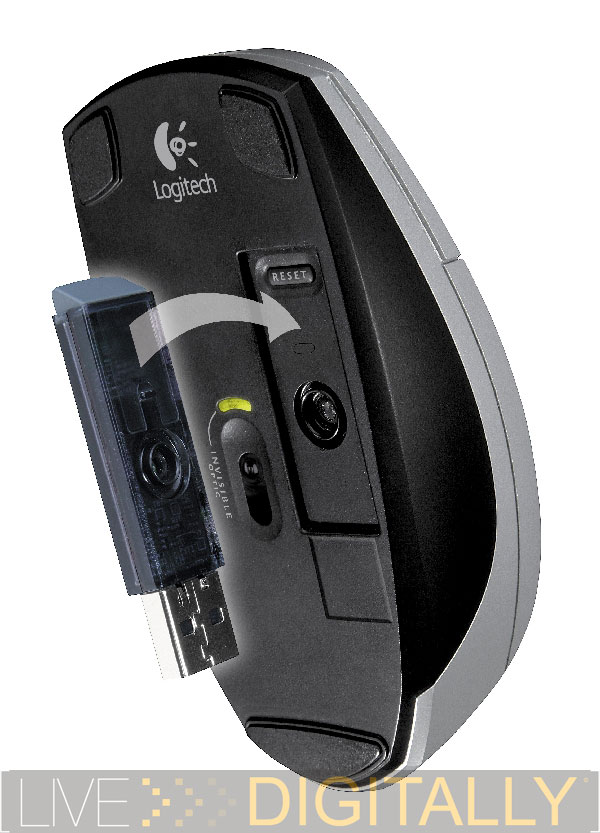 The 2.4 GHz transceiver snaps into the bottom of the unit to make a tidy package like the V500. This is not as neat as fitting inside, but it does keep the pieces together. With the transceiver on the bottom, the mouse is powered off. The small transceiver fits neatly in a USB port, and is small enough to not block neighboring ports. The V200 claims a 30 foot range; I was able to verify that up until 10 feet, after that I couldn’t see the pointer anymore on the screen! The 2.4 GHz transceiver, although on a shared frequency with Bluetooth, and WiFi, is proprietary to Logitech, and does not work with any other devices. In testing, it did not interfere with Bluetooth devices, or WiFi networking at any time in this crowded part of the radio spectrum.