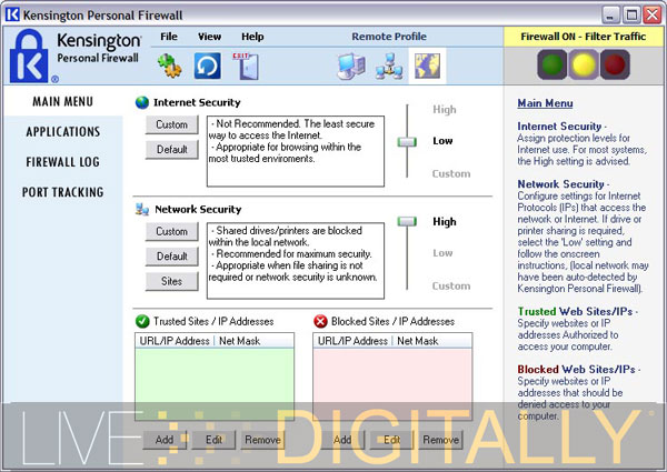 Looking at the screen shot, you’ll see that there are adjustable settings as one size does not fit all. Both internet security and network security can be adjusted between high, low and custom settings. These can be developed into profiles for home, office and remote. The traffic light in the right upper corner can be toggled between green (no filters), yellow (filtered), and red (no traffic). In addition, web sites, or network addresses can be placed on the trusted list to facilitate traffic, or blocked all together. The Kensington Personal Firewall also keeps a firewall log, and locks down any free ports to thwart any would be hackers.