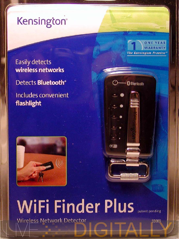 The WiFi Finder Plus will locate “b” and “g” networks, as well as a Bluetooth signal. It is powered by 2 of the larger watch style batteries (CR 2016). It has a 5 level strength meter that is designed to correspond to the bars in wireless notebook software, and in practice it did. The attached key ring can also be secured to a laptop bag strap. Finally, the yellow LED flashlight on the bottom provides ample light to find a keyhole in the dark. The entire small device is constructed out of a rubberized black plastic, and chrome.