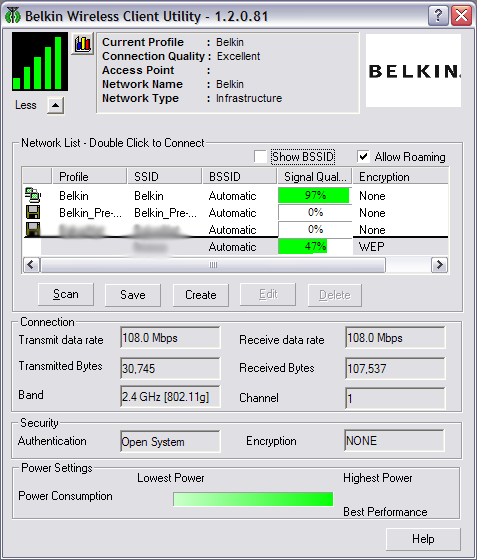 Pictured is the notebook wirelessly connected to the Belkin Pre-N Router using two different wireless adaptors. In the first configuration, I am using the notebook’s built in wireless, and in the second the Belkin Wireless Pre-N Notebook Network Card. The notebook is in the identical spot, and detecting two of my neighbor’s networks, one of which is quite strong, registering 47%. The notebook is about 50 feet away from the router, with a floor in between, and the myriad of metallic and electric obstacles mentioned before.