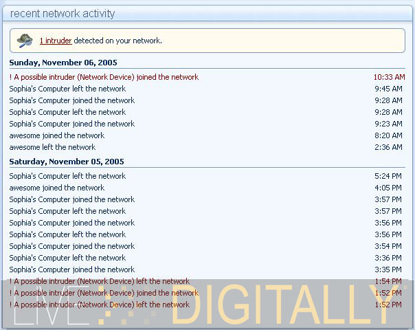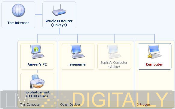 The Network Map is your view of what’s going on. The flowchart-like diagram is dynamically updated with who’s on, who’s off, and plenty of other interesting details. This is where intruders can be seen and tracked. I am also able see information about my roommate’s computer, it is named ‘awesome’, is wirelessly connected, has an Epson Stylus printer installed, is running Win XP SP2, has 128mb of RAM, has excellent signal strength, is connected at 11.0 Mbps, is using a D-Link USB wireless network adapter, and more.