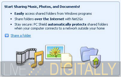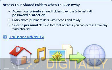 Net2Go Manager is something a bit bigger than I expected. It is the ability to share files over the internet. The simple setup requires you to create a URL in the format of http://_____.net2go.com. Once you have created your unique URL and a password, you need to enable web sharing for your chosen shared folders. Three minutes to set up the whole thing and I was sharing folders over the net. I had a friend who lives in Southern California (I’m in San Francisco) go to my net2go.com address and share some files! I see this coming in rather nicely when I want to share photos, music, video files, or accessing my important data remotely. Password protection is an option for sensitive information.