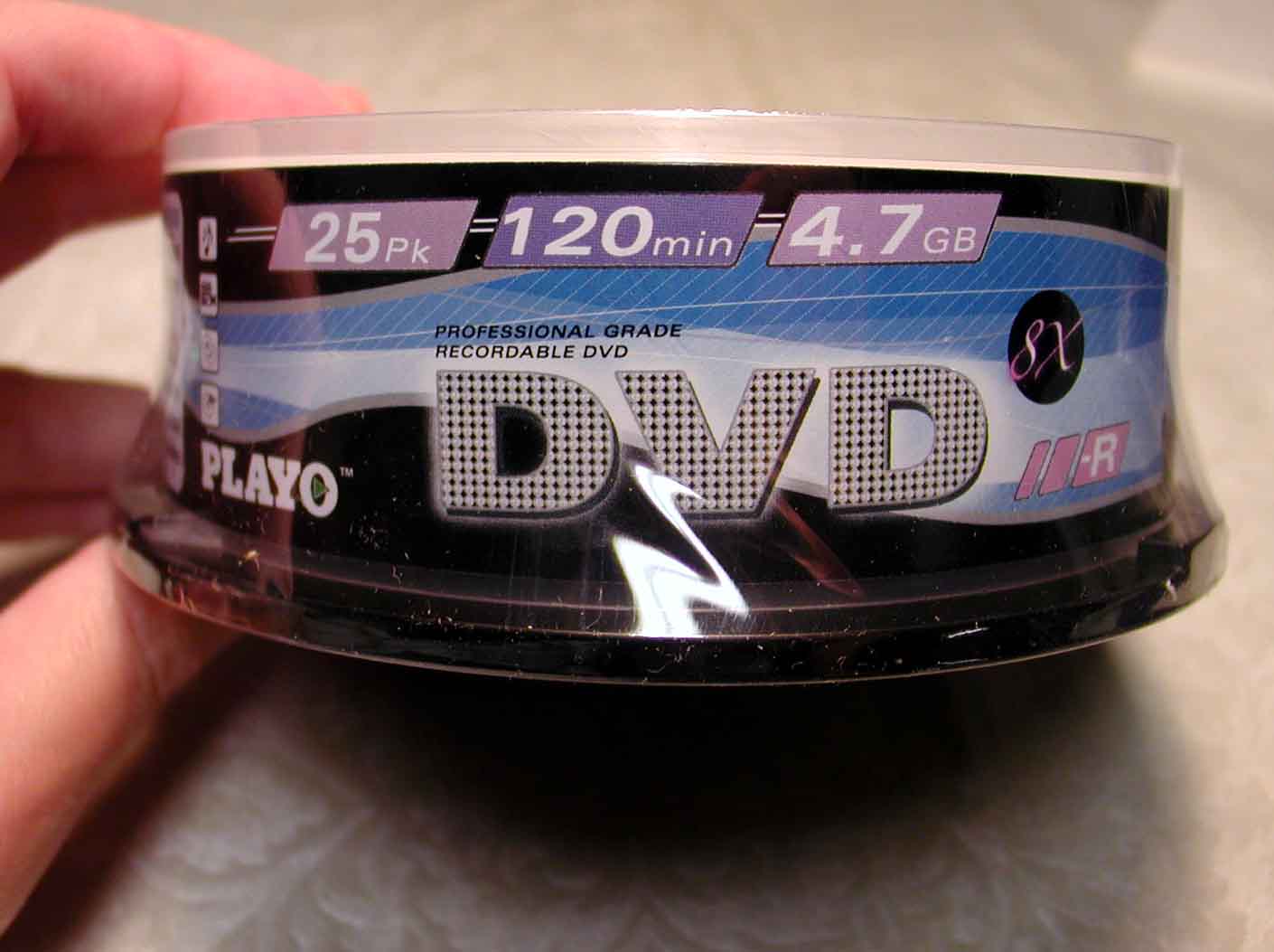 Playo’s DVD-R discs here are seen in a 25 pack, other sizes are available including a “price club warehouse” 100 pack. The discs have a silver metallic coating, the appropriate logos, and plenty of space to write on with your Sharpie marker. The discs are labeled for the 8x speed.