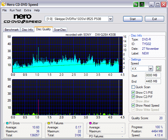 We similarly had a nice burn from the LiteOn 1693S writer. It was also burnt at 8x, in a time of 9:16 (the longest burn of the test, but only by a little bit). The PI Errors maxed out at 36, and averaged 10.6 which is very good. The PI Failures were also low with a solitary spike of 22 (which is allowed in the specs), and an average of 0.17. The disc played fine in the Sharp DV-S1U player. In my mind, both of these burns are of similar high quality.