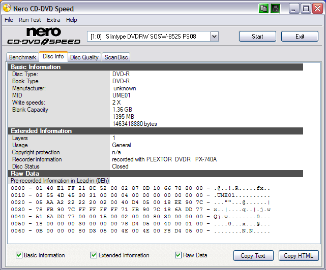 Apparently, Nero doesn’t know much about these discs either as the manufacturer is “unknown.” The capacity comes up as 1463 MB, and it is a DVD-R disc (minus, as opposed to plus. The write speed is listed at a pokey 2x, although that wasn’t an issue. I cooked the disc in the Plextor 740A drive, and performed the following scan.