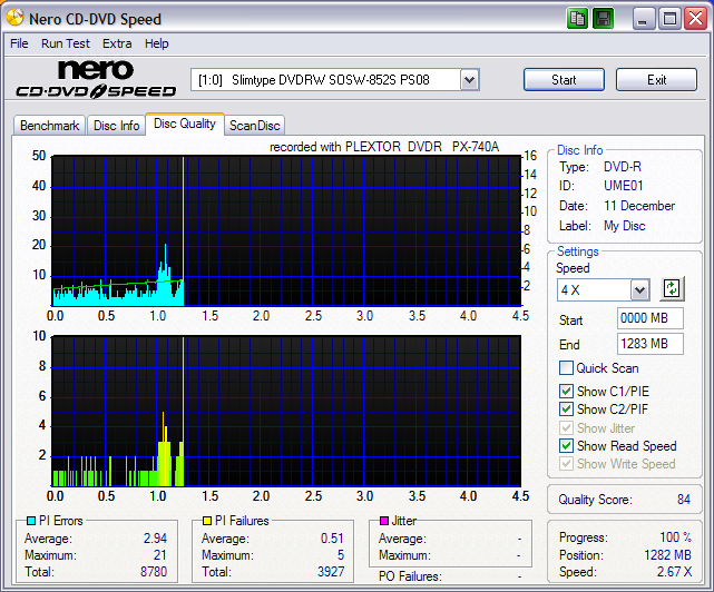 The Plextor 740A wrote the disc in 8:16, set to the 8x speed (the fastest write of the test). Overall, it is a good quality write. The PI Errors have two spikes, the taller one being 65, with an average of 2.5 which is low. The PI Failures have a max of 4, and an average of 0.1 which is also low. I was pleased with this write, and it played fine in the Sharp DV-S1U player.