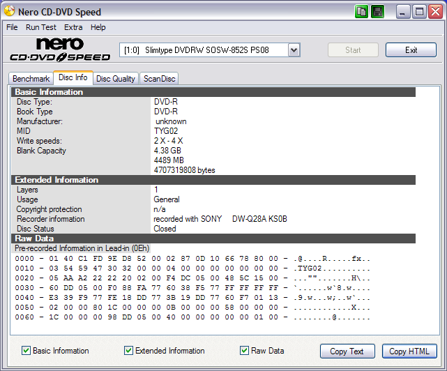 The “Disc Info” feature of Nero’s CD-DVD Speed provides some information about the discs. The code of “TYG02” would indicate Tayo Yuiden, which are Japanese, and highly regarded as some of the finest media. However, some manufacturers just put that code on their discs, so it may not really indicate such high quality.