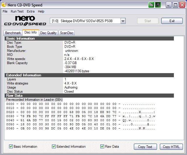 The disc info on Nero’s CD-DVD Speed shows that the DVD+R disc supports 2.4x, 4x, 6x, and 8x speeds. The manufacturer is listed as “unknown” leading me to believe that this disc is really new, and not just a relabel of someone else’s disc.