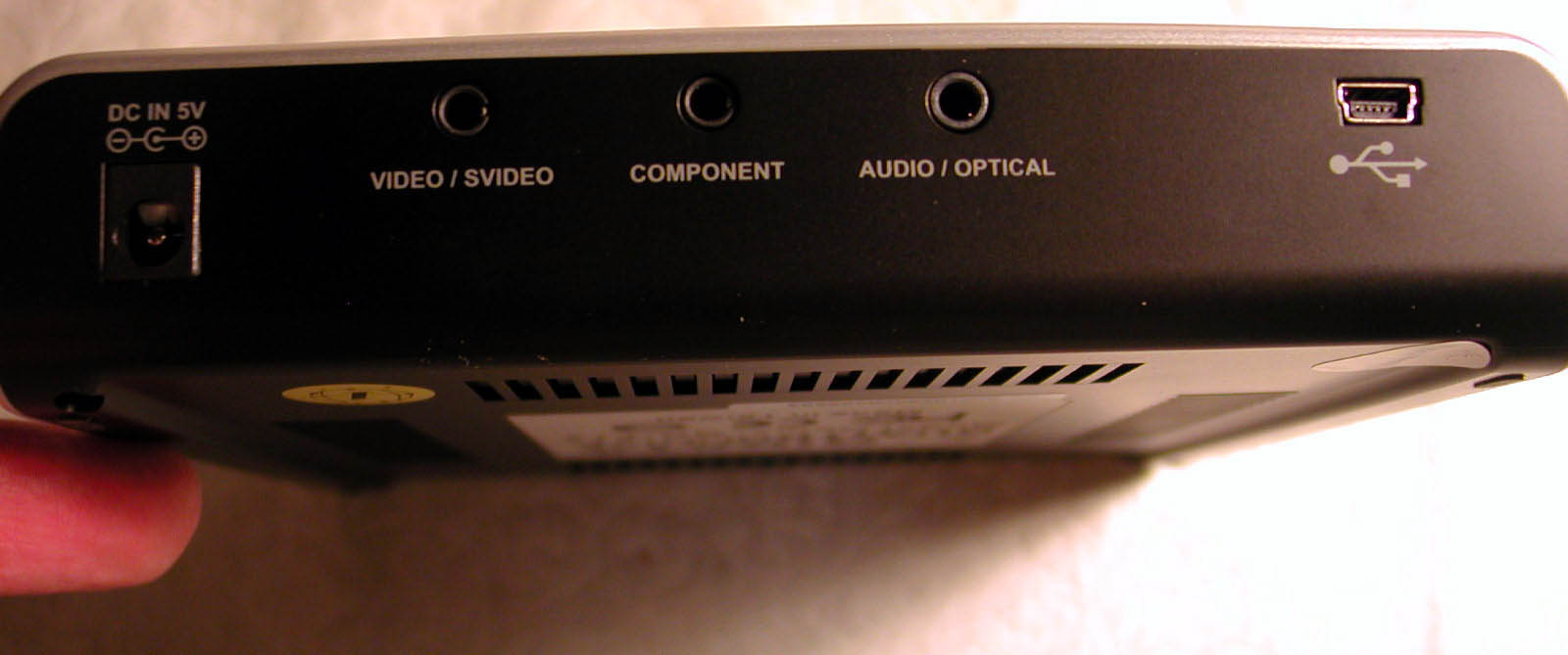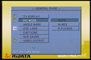The QuattroDrive connects easily to the television set with the included cable and the RCA inputs of the television. It is not documented what the component output is used for (I assume it’s for a component video output, but it’s not clear what cable I would use to do that). Once connected, the QuattroDrive is a very capable DVD drive. It can play audio CD’s, and DVD’s. It also supports some of the less common formats, like MP3 discs, Video CD’s, and JPG images (but unfortunately doesn’t support Divx or WMA). In fact, the MP3’s and JPEG’s can be played from either the optical discs, or any of the flash card slots. This makes it easy to make your own “megamix” or slide show for playback. Viewing pictures this way, with a remote, is a lot more elegant than sitting next to the TV, holding my digital camera, and hoping the battery doesn’t run out! Parental controls round out the package. In use, the drive played back our movie DVD’s as well as any other DVD player I’ve tested.