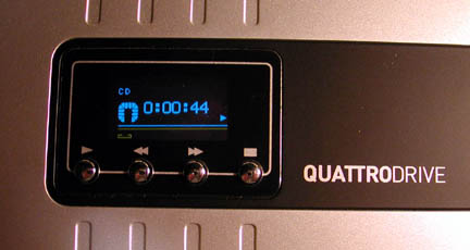 The remote resembles a standard DVD player remote control. It connects to the QuattroDrive via infrared. It worked fine from over 12 feet away even when a little off center. Unfortunately it uses a watch battery for power, so it will cost a little more to replace, but this is a trend we’ve seen in other remotes in their quest for slimness. The mute button comes in handy when playing discs and the phone rings.