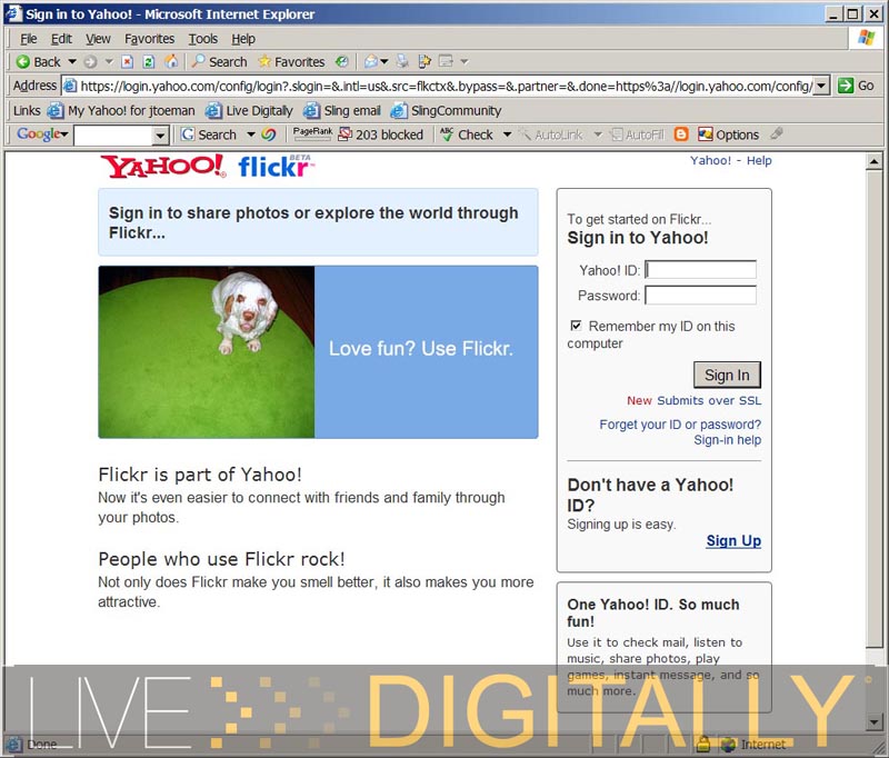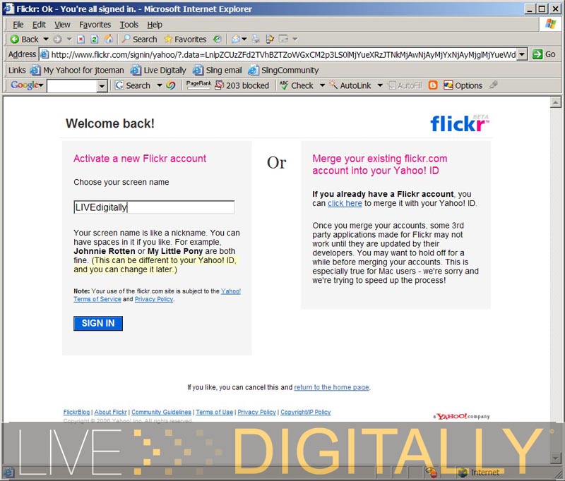 The first three pictures show the steps to get a flickr account set up. I already use a yahoo account (mostly because my.yahoo.com is great), so according to my timer it took a grand total of 15 seconds to get activated.