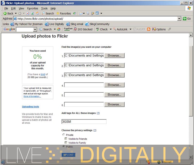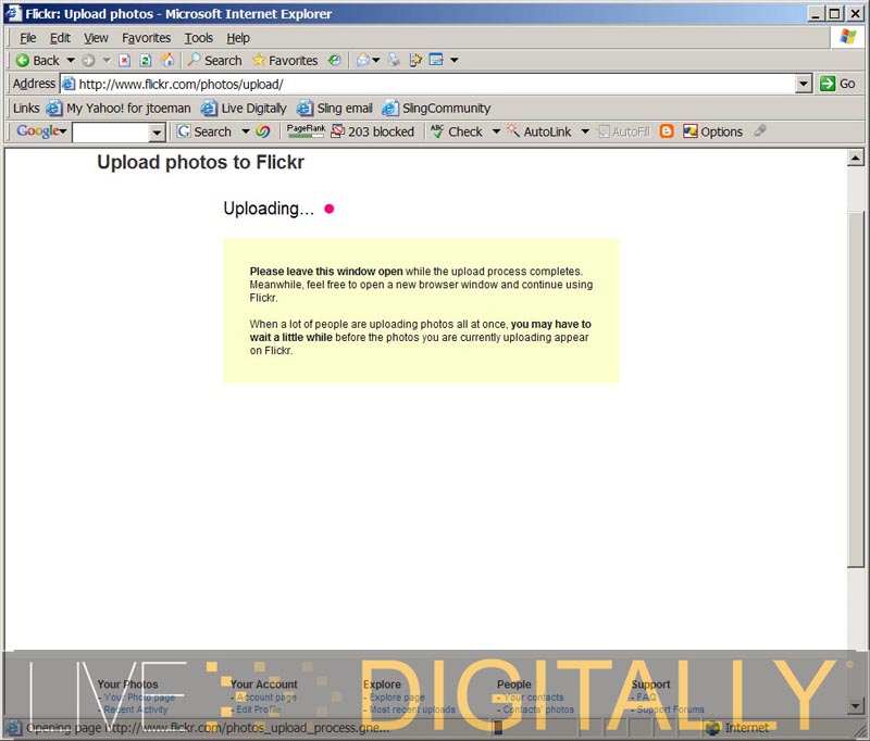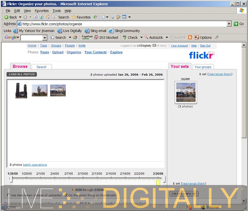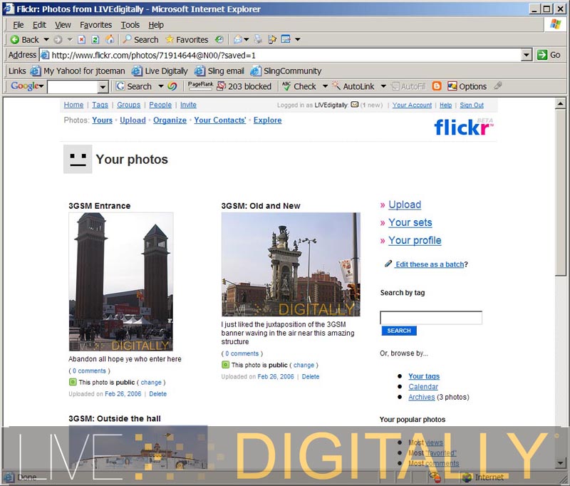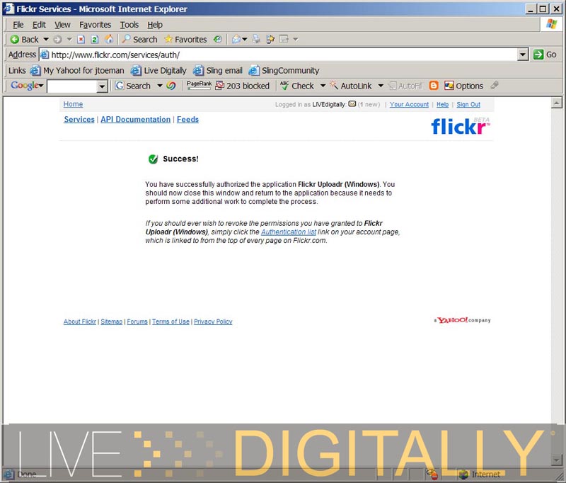 You can see the step-by-step photos of me getting going with flickr. I actually timed the entire process, which took a grand total of 10:15 to get a batch of photos uploaded, tagged, and active on my flickr site!