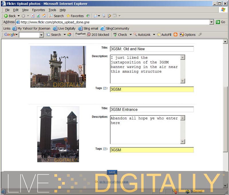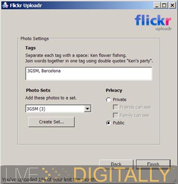 Next, I uploaded 3 pictures from my 3GSM coverage, just to try out the manual upload process. This took another minute, after which I was prompted to create titles, descriptions, and most importantly, tag the pictures.