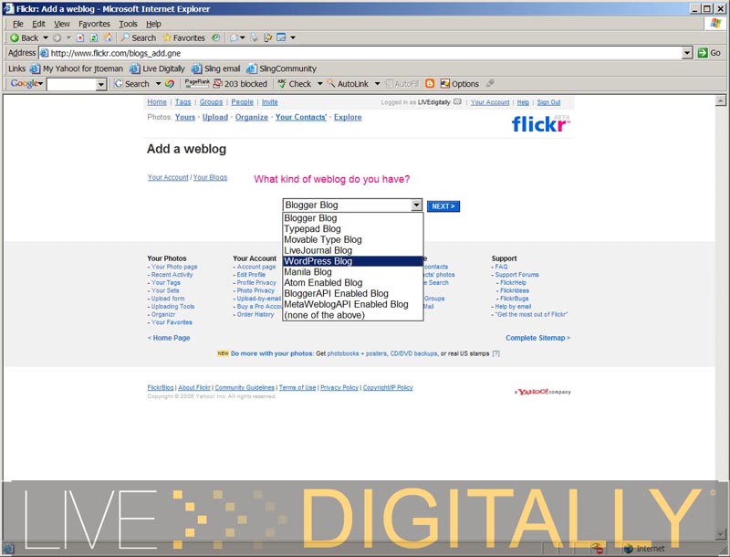 Now, if you happen to run a blog, here are the extra steps it takes to set Flickr up with your blog. No exaggeration, this took an additional 2 minutes total, including my test post.