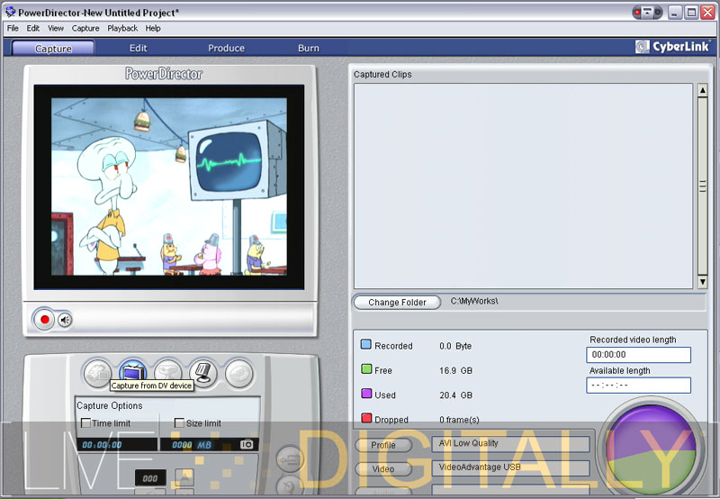 Next up to the Cyberlink PowerDirector video capture software. My aim was to capture a tidbit of Spongebob Squarpants the movie, which I had on DVD. I fired up Cyberlink’s recording solution, plugged in my Video Advantage USB to the DVD player and hit play. I wasn’t looking to make an entire copy of the Spongebob movie, only a 30-60 second clip for testing purposes, when I was abruptly halted by a message box saying that “This movie is copyright protected. Recording is Prohibited” I found this to really irk me.