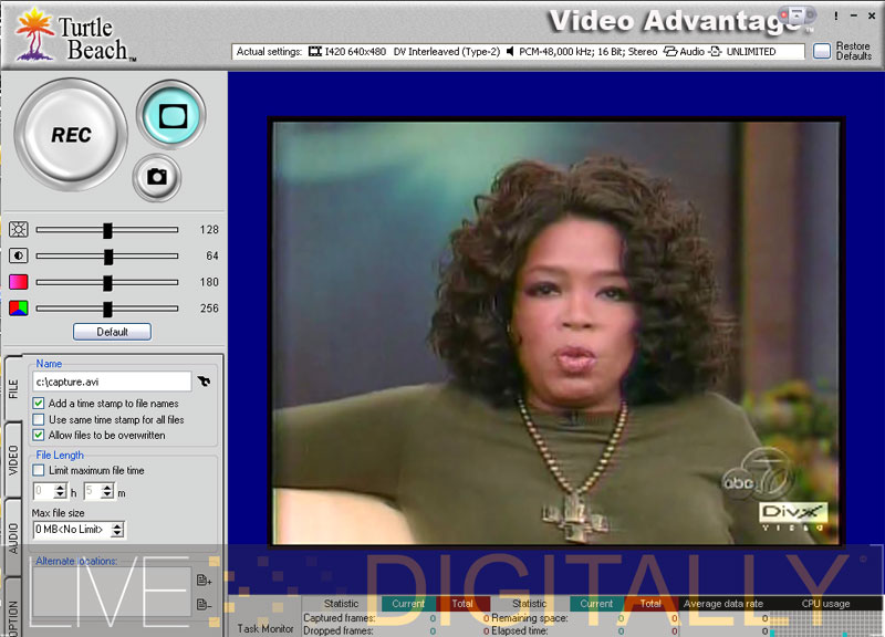 First up to test was the Turtle Beach AD Full Cap, which is used to capture video and audio (stereo) in DV format. With a width of 720 and a height of 480 (pixels) and a framerate of 29.970 fps (frames per second), I was ready to capture. I plugged in the Svideo cables to the TV and guess who’s on? Oprah! I captured Oprah in DV format and boy did she look and sound great. The problem is that she was huge, I mean her file size was huge. I captured 21 short seconds of her at 740×480 and that took up 73 Megabytes (Mb). That’s about 3.5Mb per second of capture, meaning a 30 min show would take up 5.7 Gigs of hard drive space. The quality is superb, but the size is just impractical for hard drive storage. This application would be only used for capturing the video and then converting or burning to a DVD.
